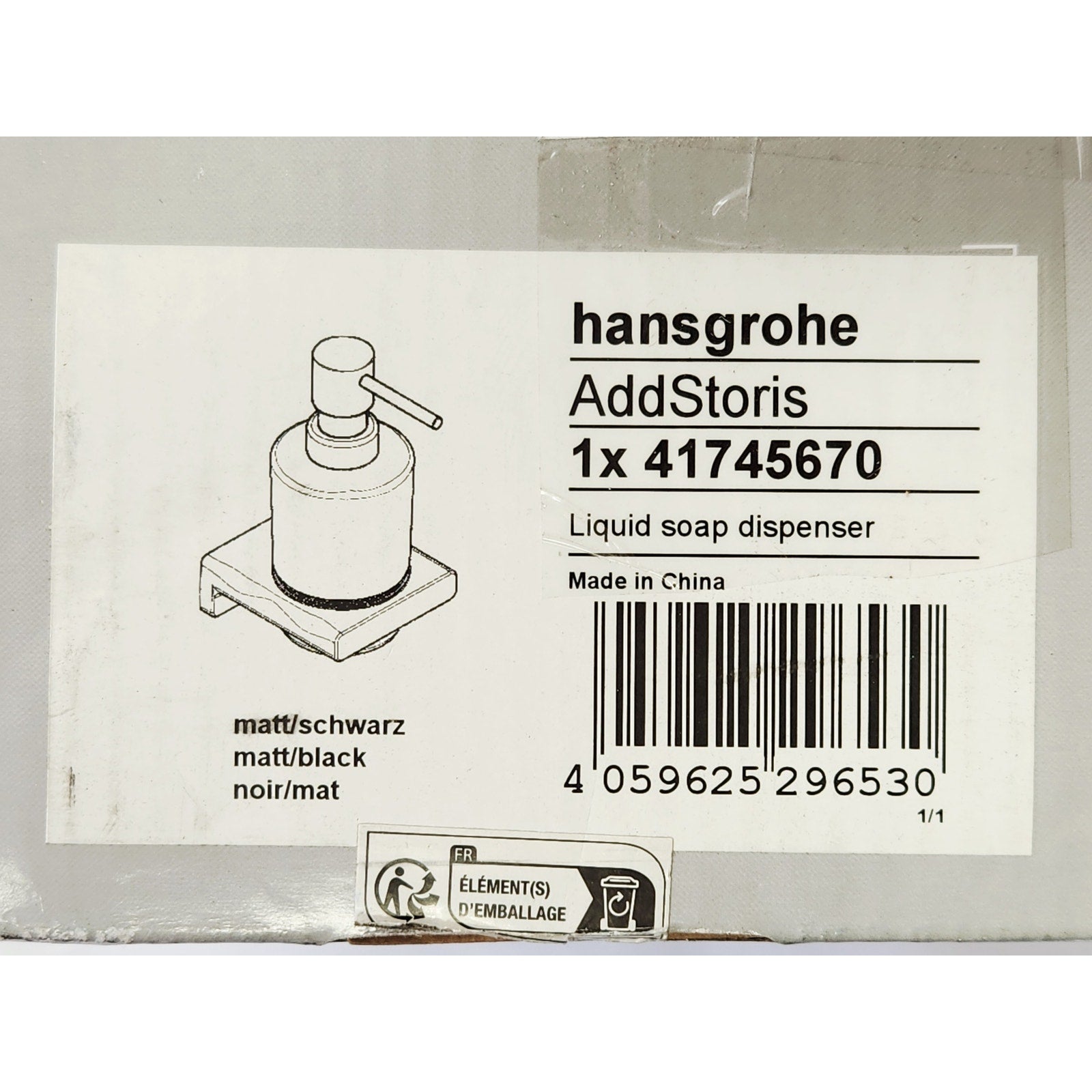 Attractive soap dispenser from hansgrohe in matte black. With the AddStoris soap dispenser from hansgrohe the bathroom is both functional and visually enhanced. The glass container takes approx. 16 oz of liquid soap and dispenses it cleanly portioned by pressing the pump. The modern and reduced design impresses with a clear, expressive design. It fits particularly well with geometric bathroom fittings, such as the hansgrohe line Metropol. Nice that the hansgrohe quality keeps what the high-quality design promises: the AddStoris soap dispenser is made of metal and glass. It is therefore particularly durable. This helps in the sustainable use of resources and reduces the plastic content in the environment. The matte metal surface in matte black is Easy to clean. It corresponds to the color of the hansgrohe special surfaces for fittings (FinishPlus). So everything fits perfectly together. Easy to install. The soap dispenser is reliably attached to the wall by 2-screws. The drilling distance is 0.9 in.