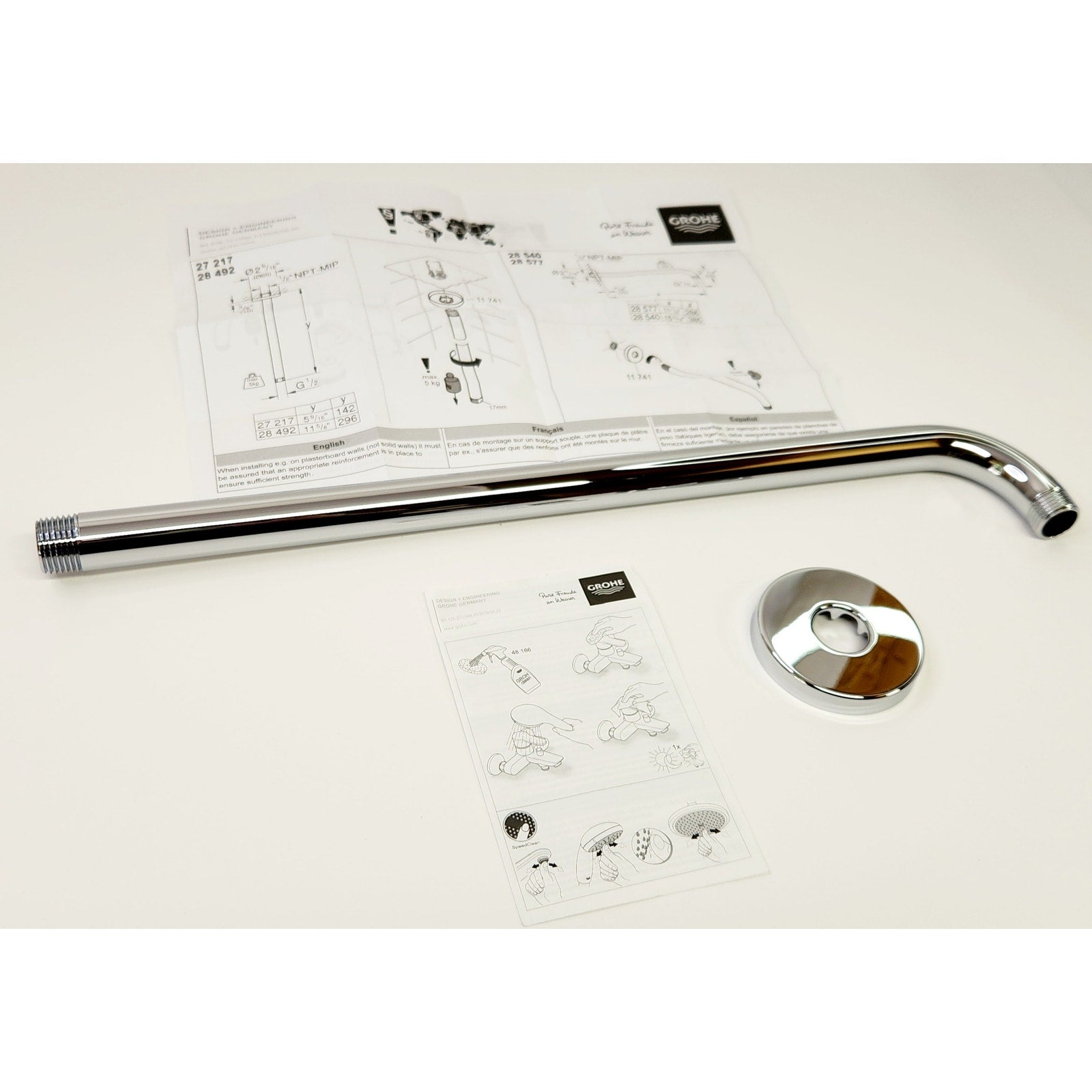 Complete your shower installation with the stylish, functional GROHE Rainshower Shower Arm in StarLight Chrome. This brass shower arm includes a flange and features 1/2 in. MNPT threads. By combining superior technology with a choice of breath-taking designs, Grohe can provide you with all the elements to enhance your bathing space.