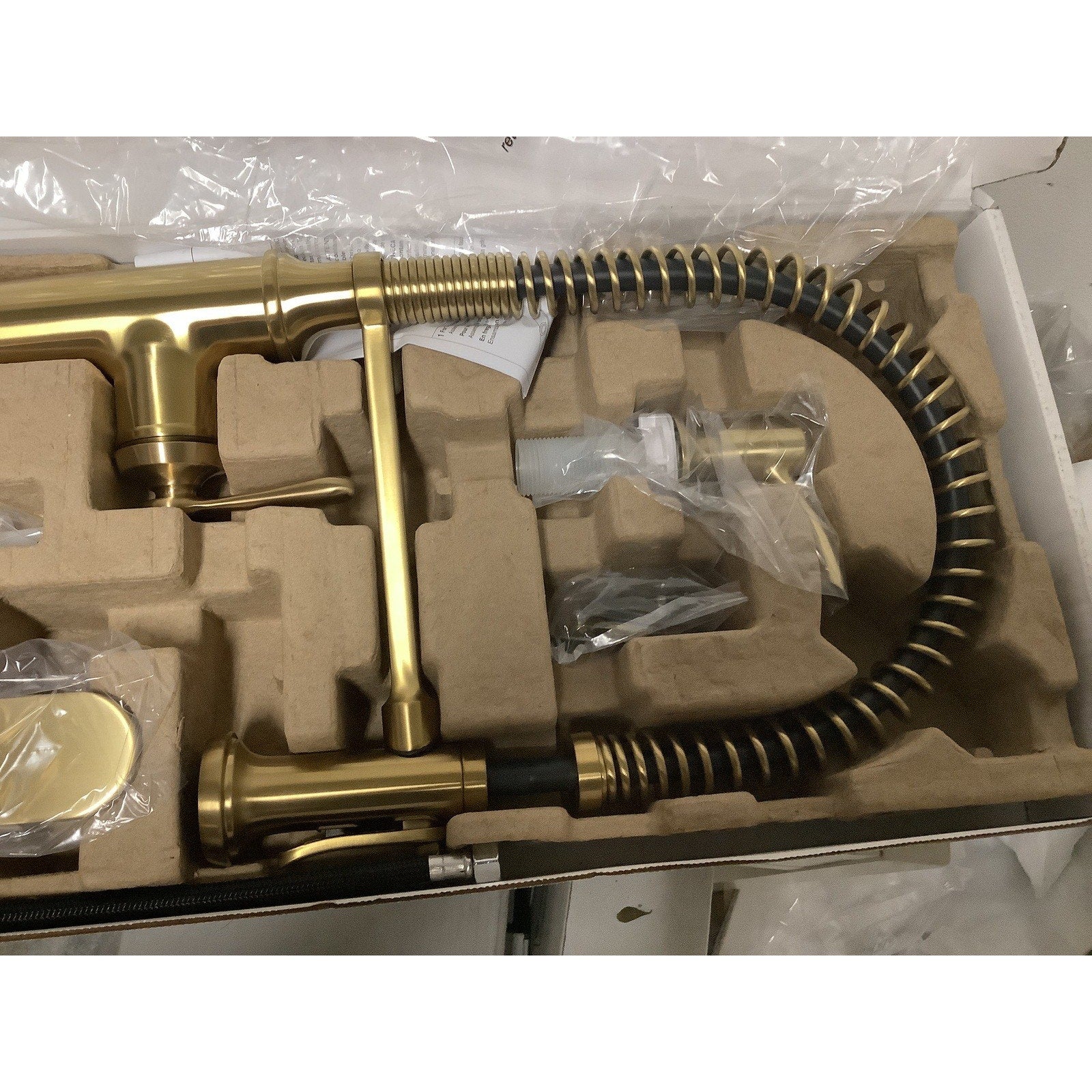 Inspired by the design of professional kitchens, the Sous pull out kitchen faucet will bring to life your inner chef. It includes assembled faucet, 29-1/2 in. supply lines, soap/lotion dispenser, and deck plate. Its high arch and unique exposed-spring design exceptional control and flexibility.