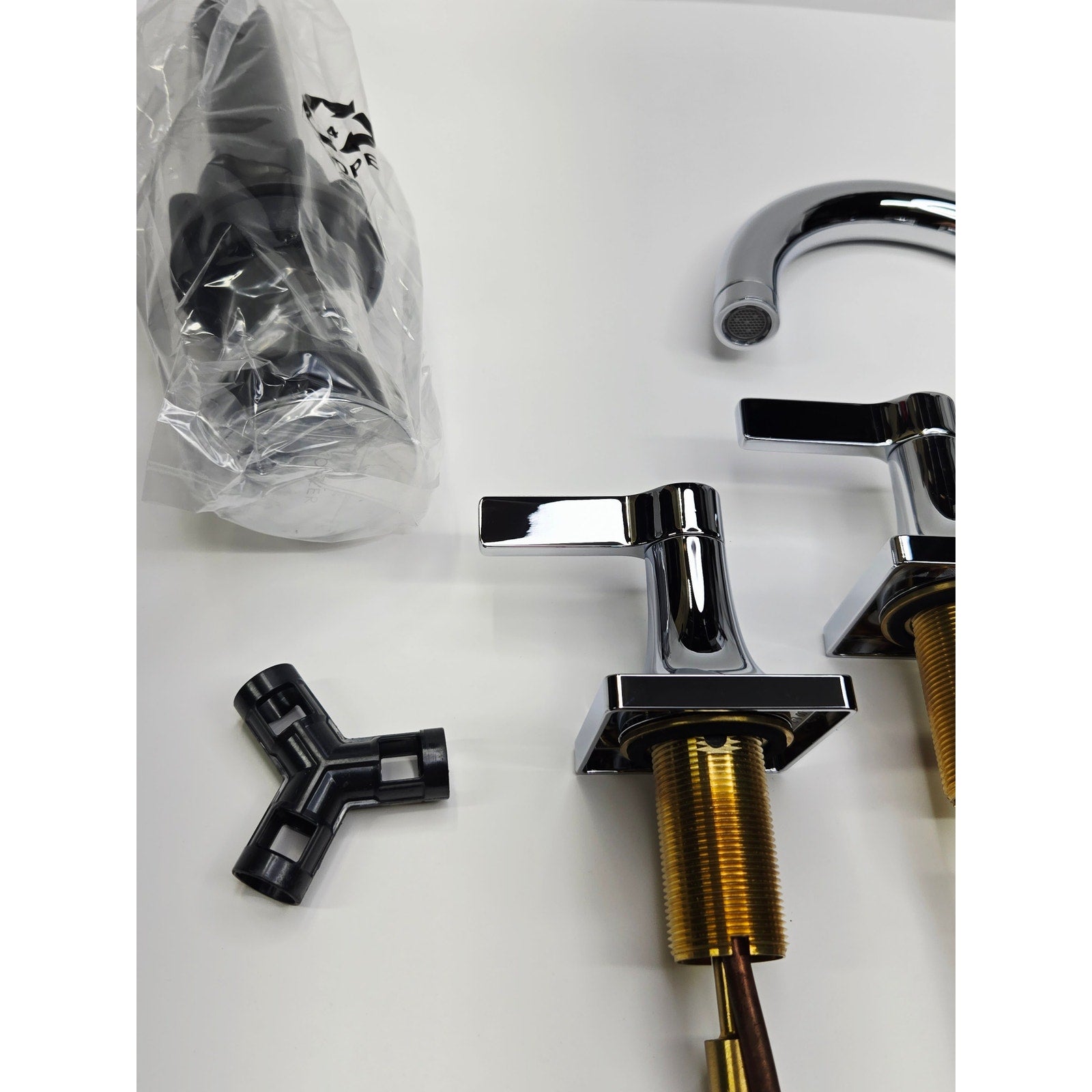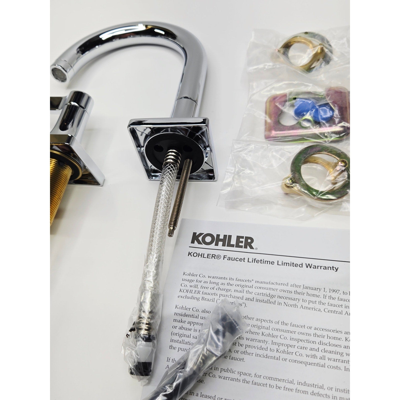 Box includes assembled faucet spout, handles attached to valves, and clicker drain