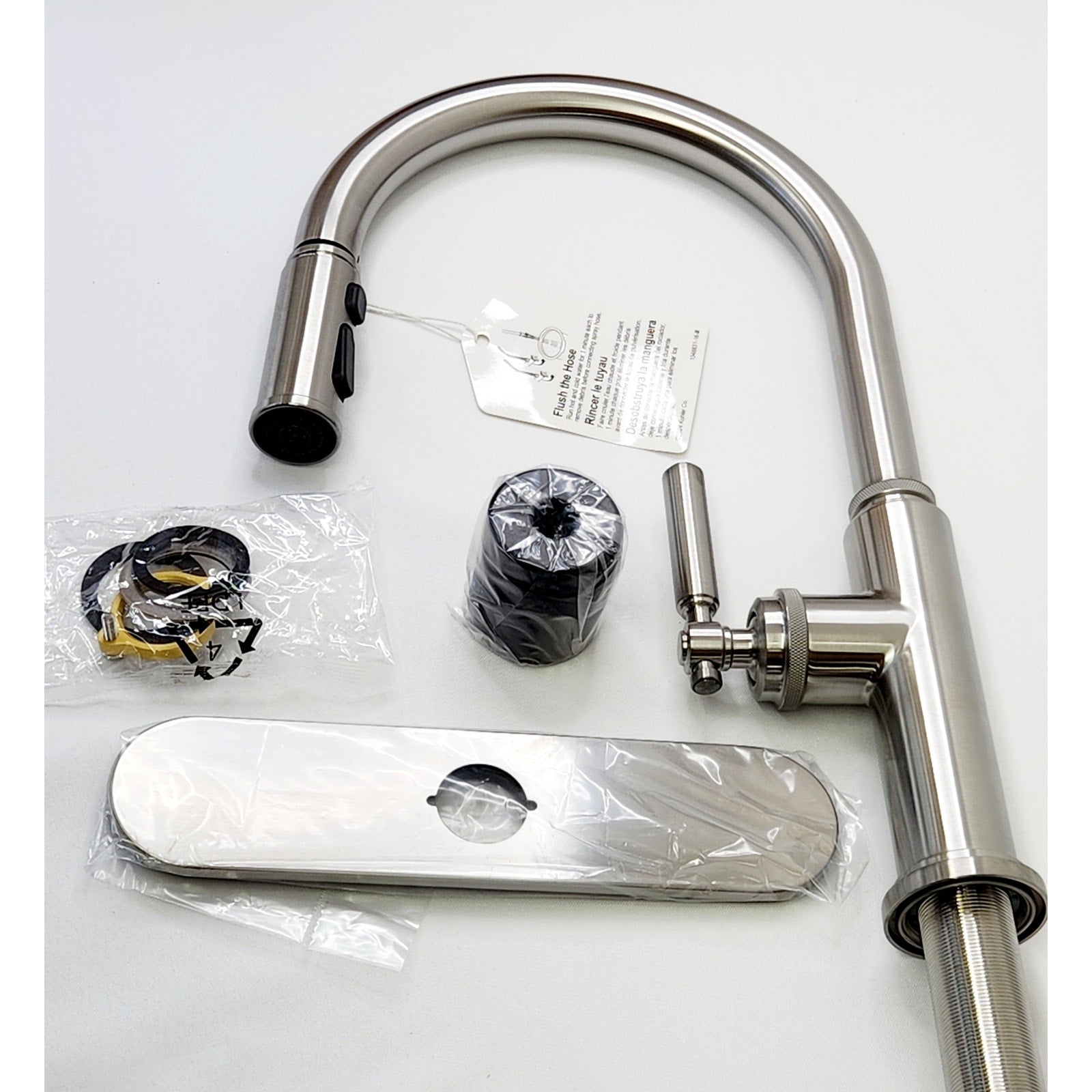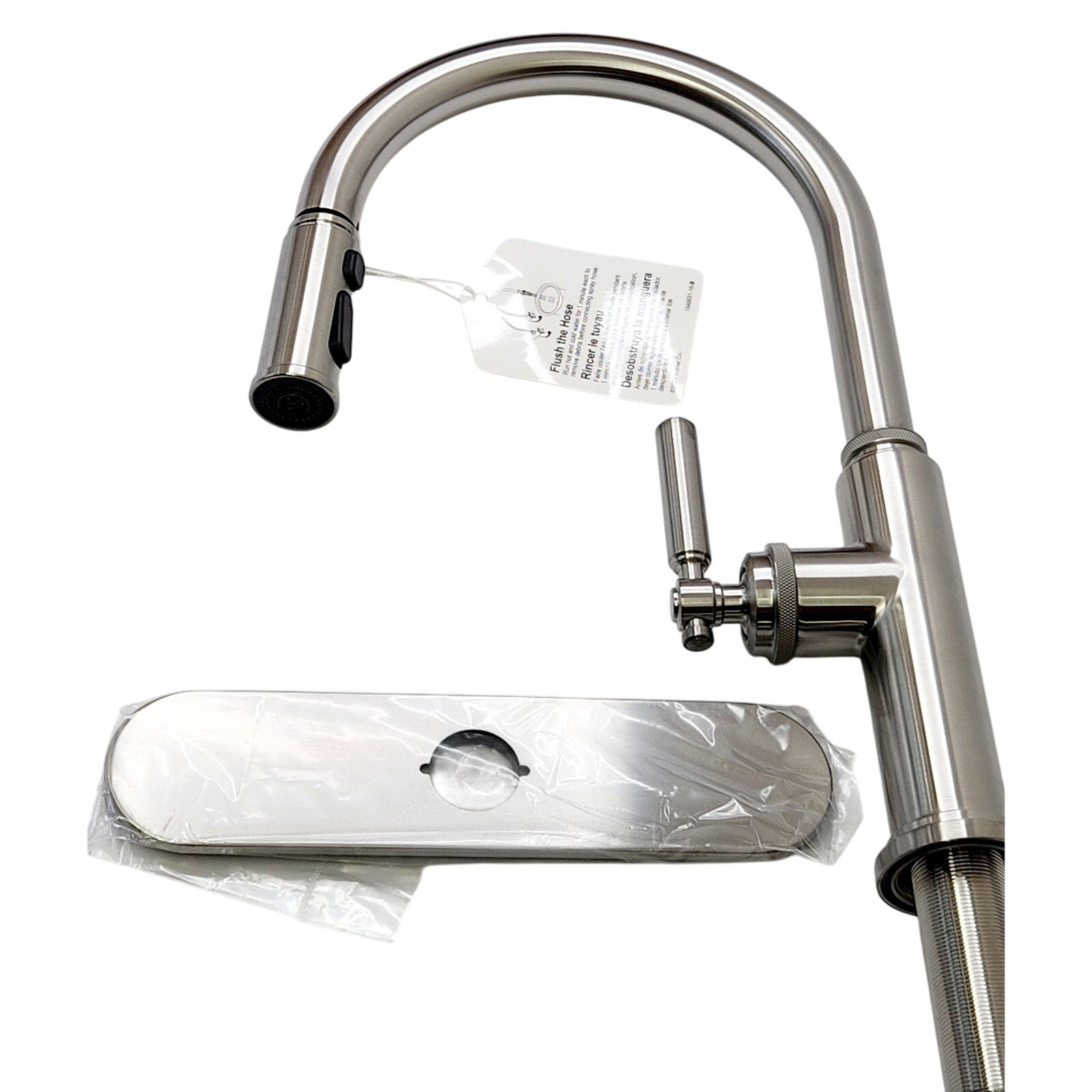 Box includes: assembled faucet, supply lines, escutcheon plate
