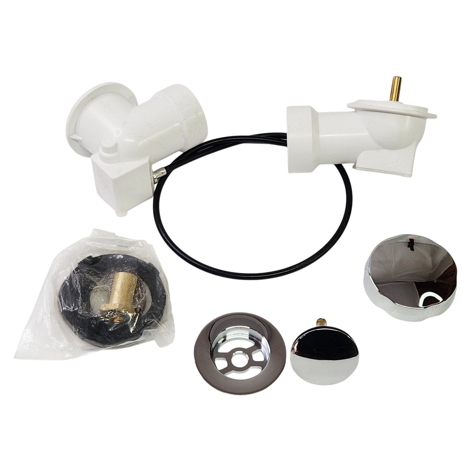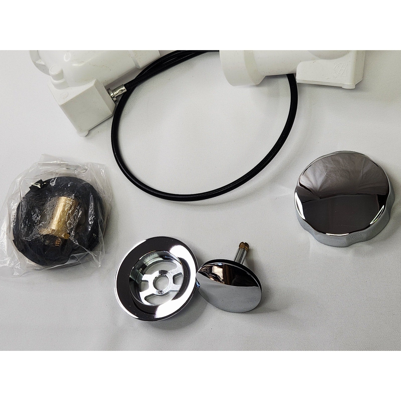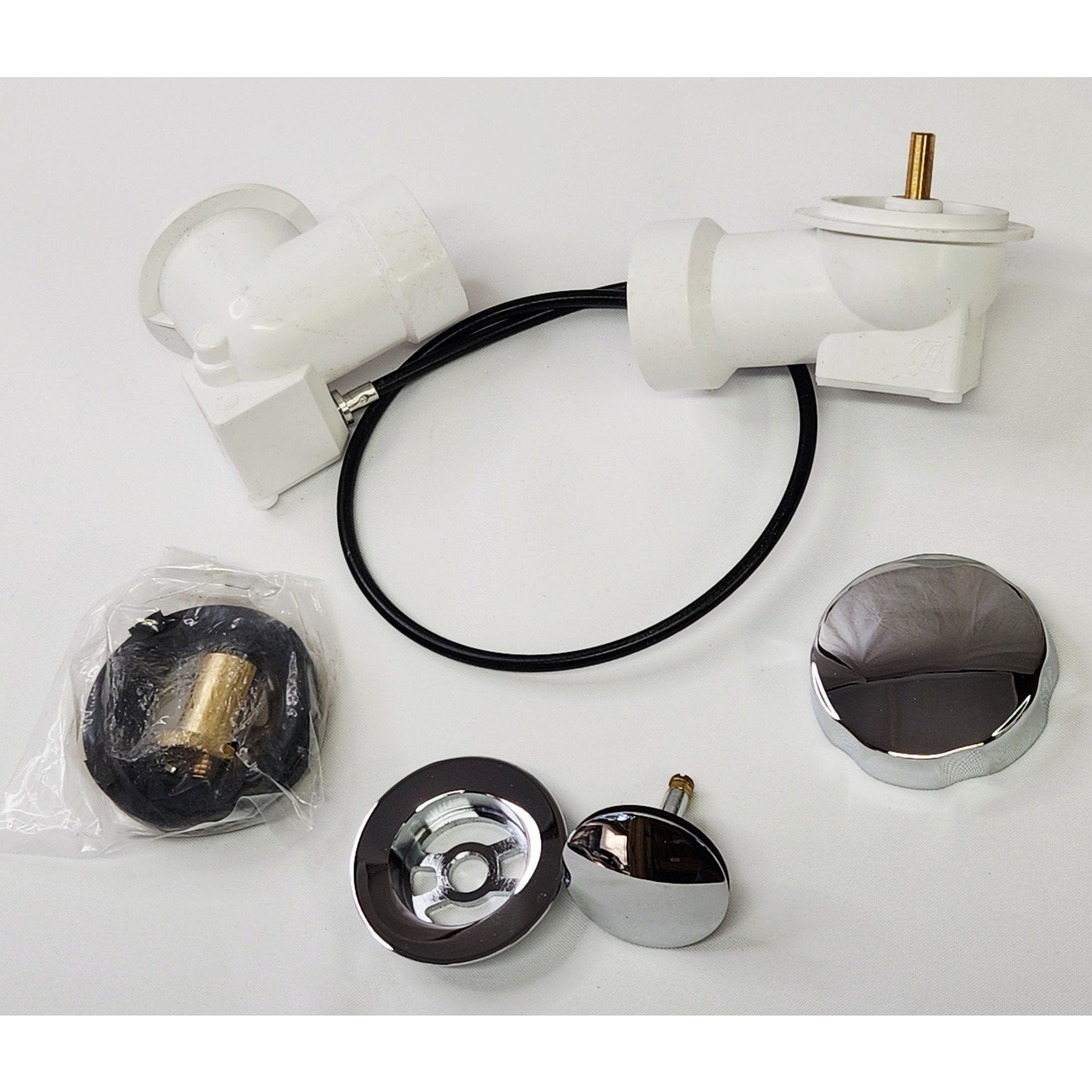 The bathtub Cable Drain & Overflow Kit is controlled by its easy-to-turn knob. A concealed, metal cable that runs along the outside of the pipes to the drain opens and closes the stopper as the knob is turned. This efficient design along with durable brass construction ensure this drain will be a lasting addition.