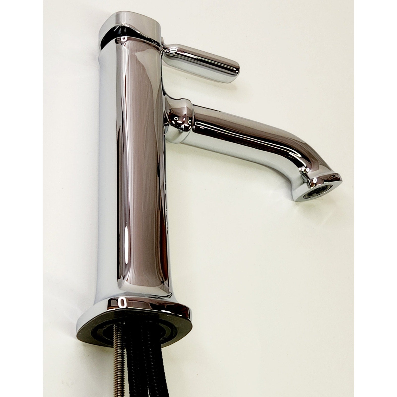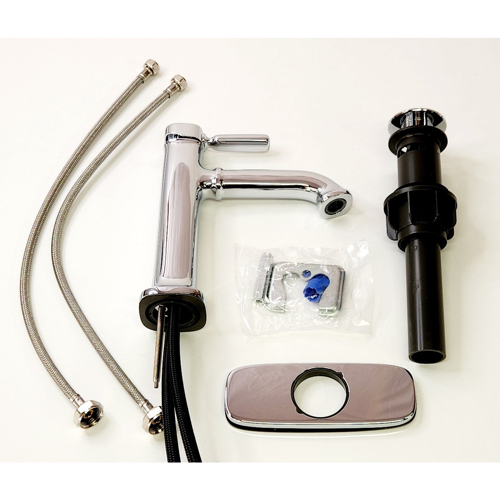 Box includes: assembled faucet, supply lines, escutcheon plate, clicker drain