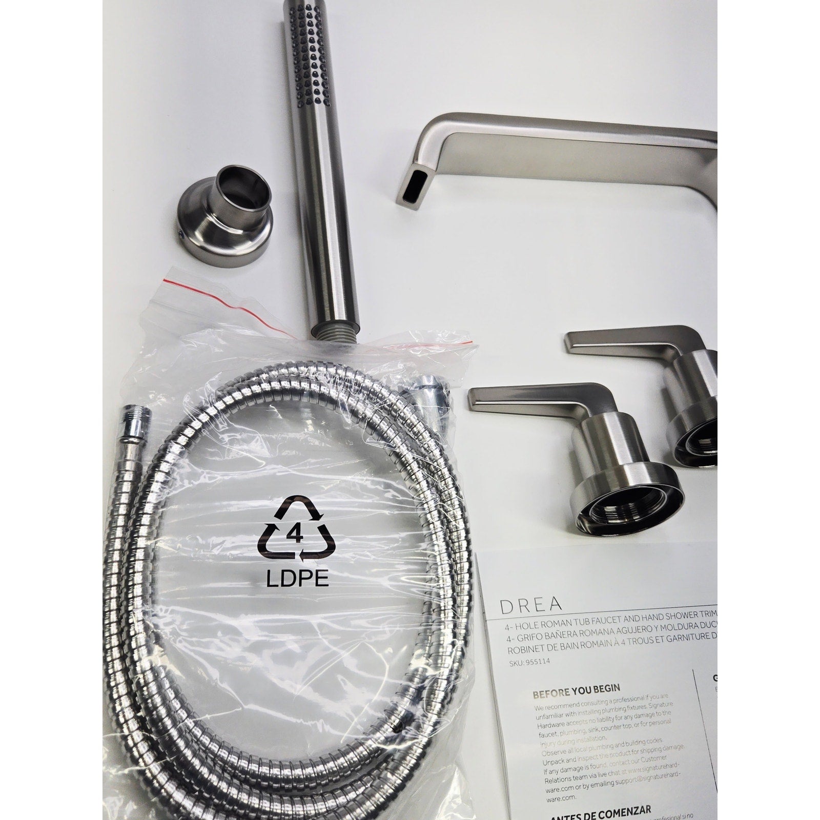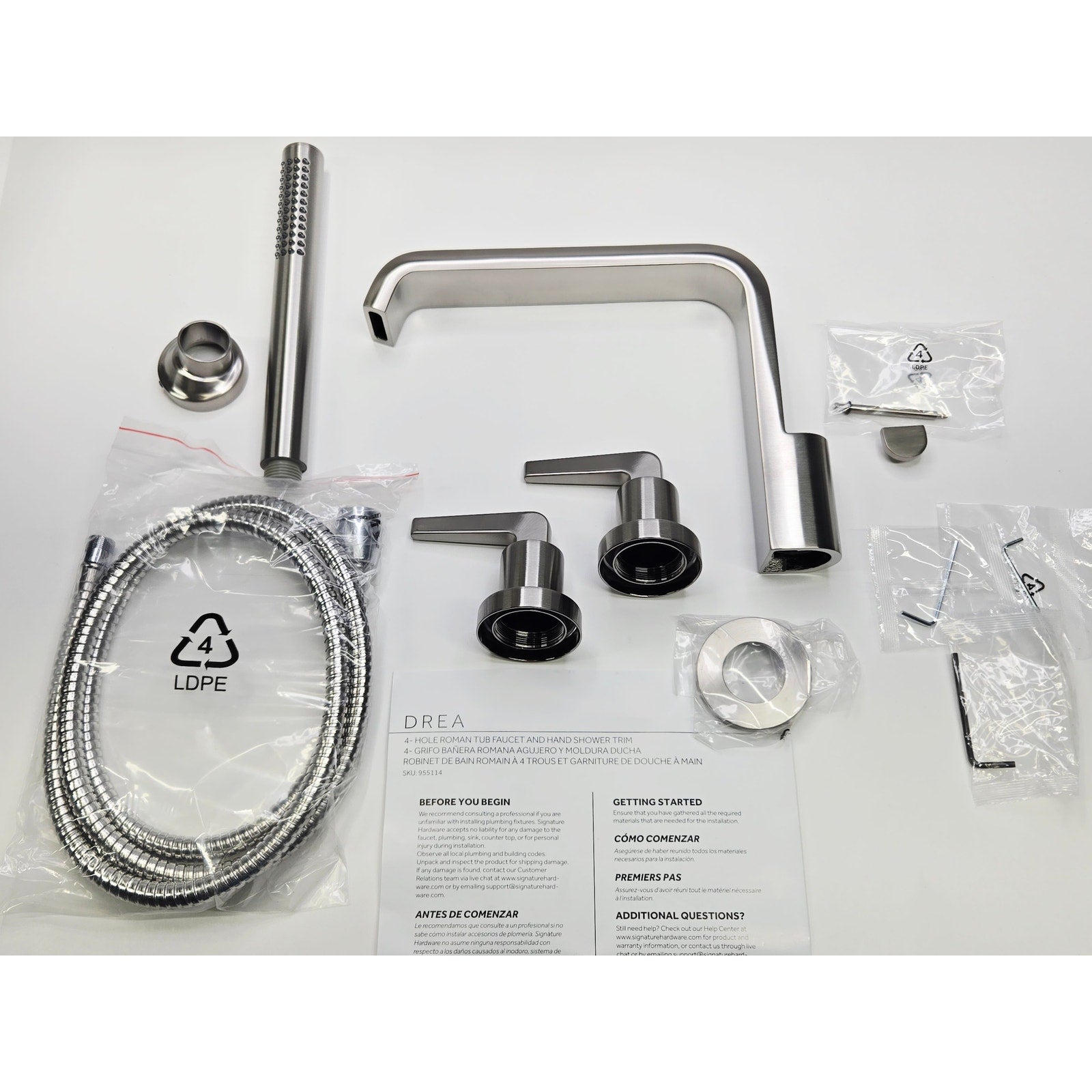 Elevate your bathroom with the Drea 4-Hole Roman Tub Faucet and Hand Shower. With its sleek lever handles and minimalist design, this tub faucet adds a touch of modernity to any space. For added luxury, the Drea features a hand shower and flexible hose to make rinsing simple and convenient. Constructed from high-quality metal and available in an array of corrosion-resistant finishes, this high-end faucet is built to last.